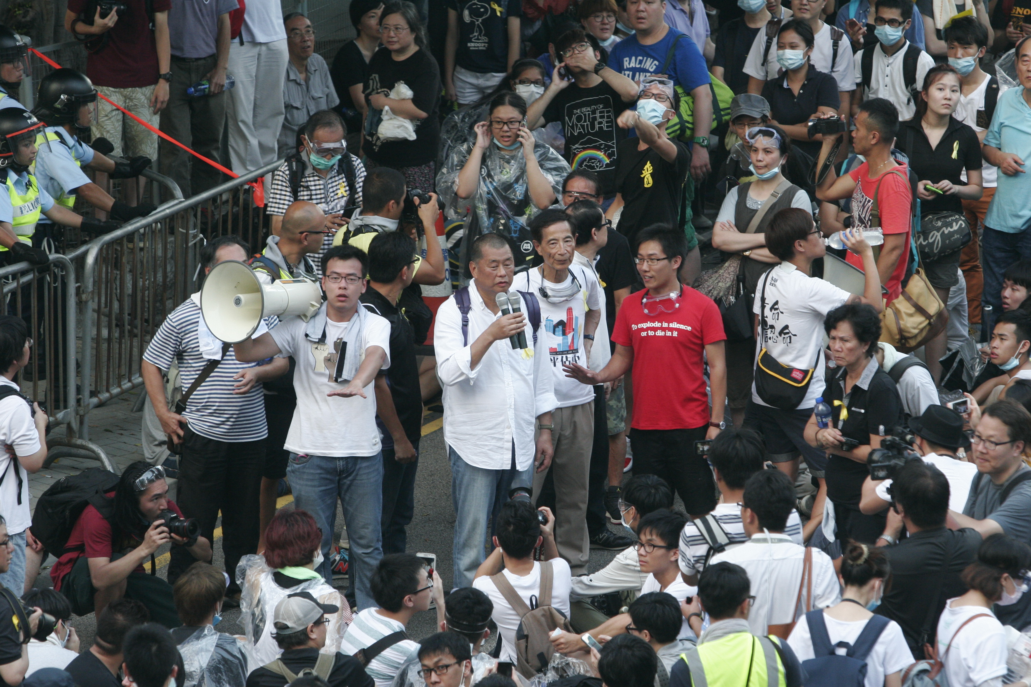 2014年違法「佔中」期間,黎智英及攬炒派多人參與其中,並於當年「佔中」清場時與劉慧卿、何俊仁、梁家傑、毛孟靜、陳偉業及陳志全等人被捕,及後再被警方以「組織及召集他人參與未經批准集結」及「參與未經批准集結」預約拘捕。