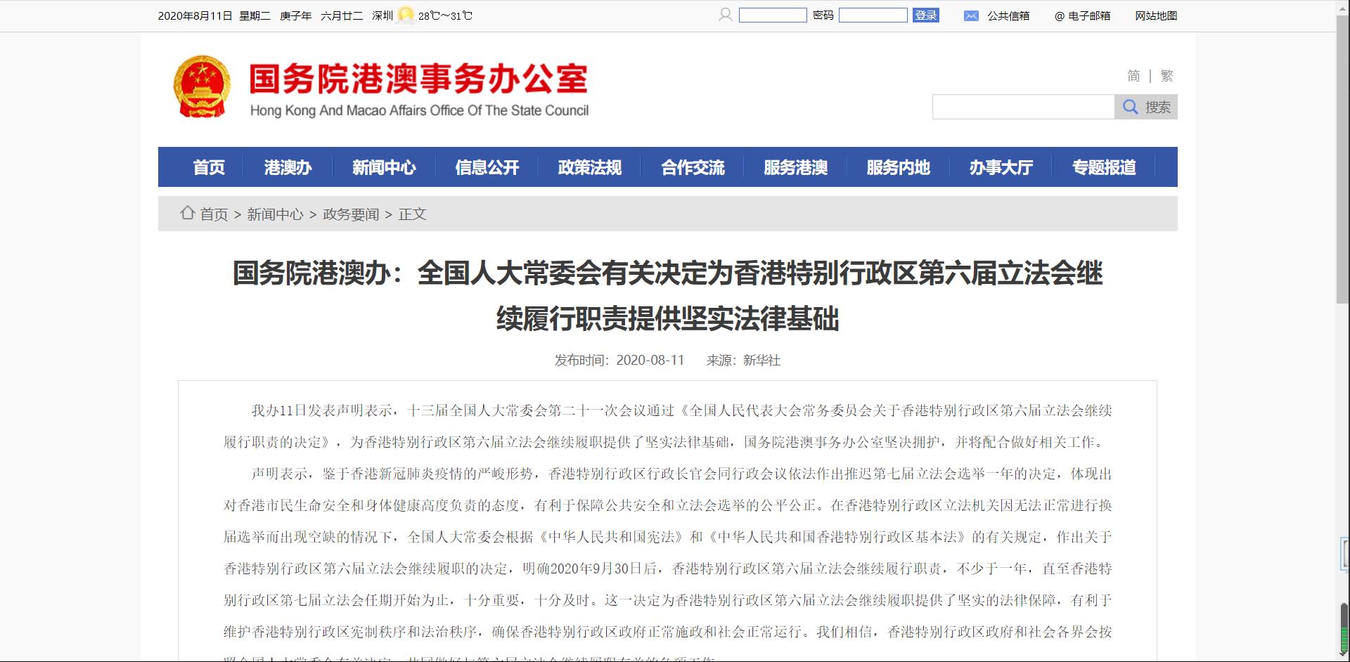 今日,十三屆全國人大常委會第二十一次會議通過《全國人民代表大會常務委員會關於香港特別行政區第六屆立法會繼續履行職責的決定》。港澳辦當天發表聲明表示,人大常委會的決定為香港特別行政區第六屆立法會繼續履職提供了堅實法律基礎,國務院港澳事務辦公室堅決擁護,並將配合做好相關工作。