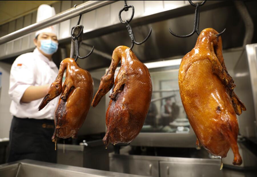 清同治三年,前門外做生雞鴨攤檔的楊全仁,改行經營飯館,打出「全聚德」的名號,招攬了宮裏孫老爺子的徒弟掌爐,改變了「便宜坊」的燜爐燒鴨,變成果木明火掛爐。烤爐前掛上「金爐不斷千年火,銀鈎長掛百味鮮」的對聯,飯館中所有人不得靠近,店主專派一個可靠的家裏人,任務是不錯眼珠地盯住烤爐。烤鴨的工藝是最高機密,為了不外傳,烤爐的師傅70歲才能傳徒弟。