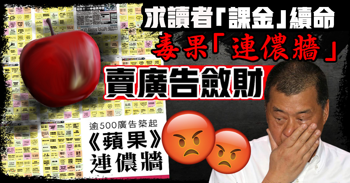 據大公文匯全媒體報道,《蘋果日報》近日因營運困難而不停要求讀者「課金」續命。肥佬黎早兩日被拉,《蘋果日報》即刻借題發揮斂財,自吹會「熱賣」,喺肥佬黎被拉翌日就印咗55萬份報紙,唔少「黃絲」KOL更熱情推銷,點知全港滯銷。今日出版的《蘋果日報》,封面及內頁13個全版當作「連儂牆」,印上各種挺蘋果文宣。這種虛張聲勢、夜間行路吹口哨壯膽的做法,不過是打所謂的「悲情牌」賣廣告斂財罷了。