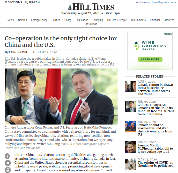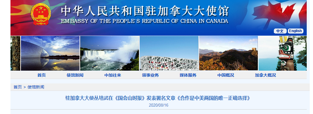 據中國駐加拿大大使館官方網站消息,2020年8月12日,駐加拿大大使叢培武在加拿大主流媒體《國會山時報》發表題為《合作是中美兩國的唯一正確選擇》的署名文章,全文如下: