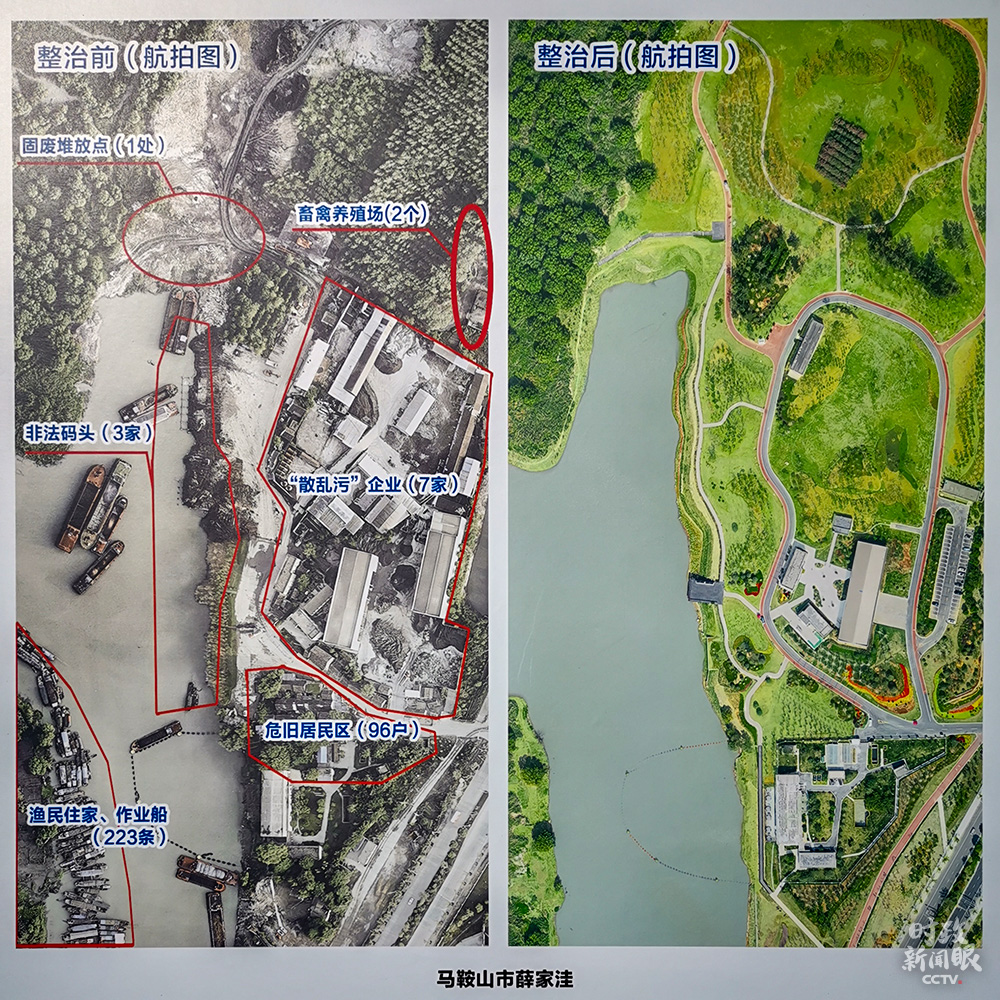 以前的薛家窪,遍地散落非法碼頭、散亂污企業、危舊民居,排污超標、鋼渣滿地。去年4月,馬鞍山市開展生態環境攻堅戰行動,徹底拆除沿岸違規建築,57戶229名漁民也全部上岸。