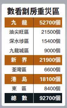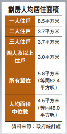 政府統計處數據顯示,全港9.27萬間劏房共住了約21萬人口,人均居住面積只有62.4平方呎,中位數更僅得48平方呎,遠低於一般全港家庭住戶的161.5平方呎,亦不及公屋75平方呎的人均居住面積最低標準。