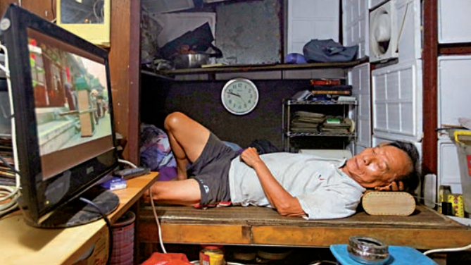 秋哥說,房內僅有一張床,無枱無櫈,日常生活就連看電視,也只能坐在床邊以80度角側視。「屈膝」多年,他慨嘆,「都係咁喇,而家七十多歲,慶幸仲爬到梯。有一日無法爬梯時,先再諗辦法。」