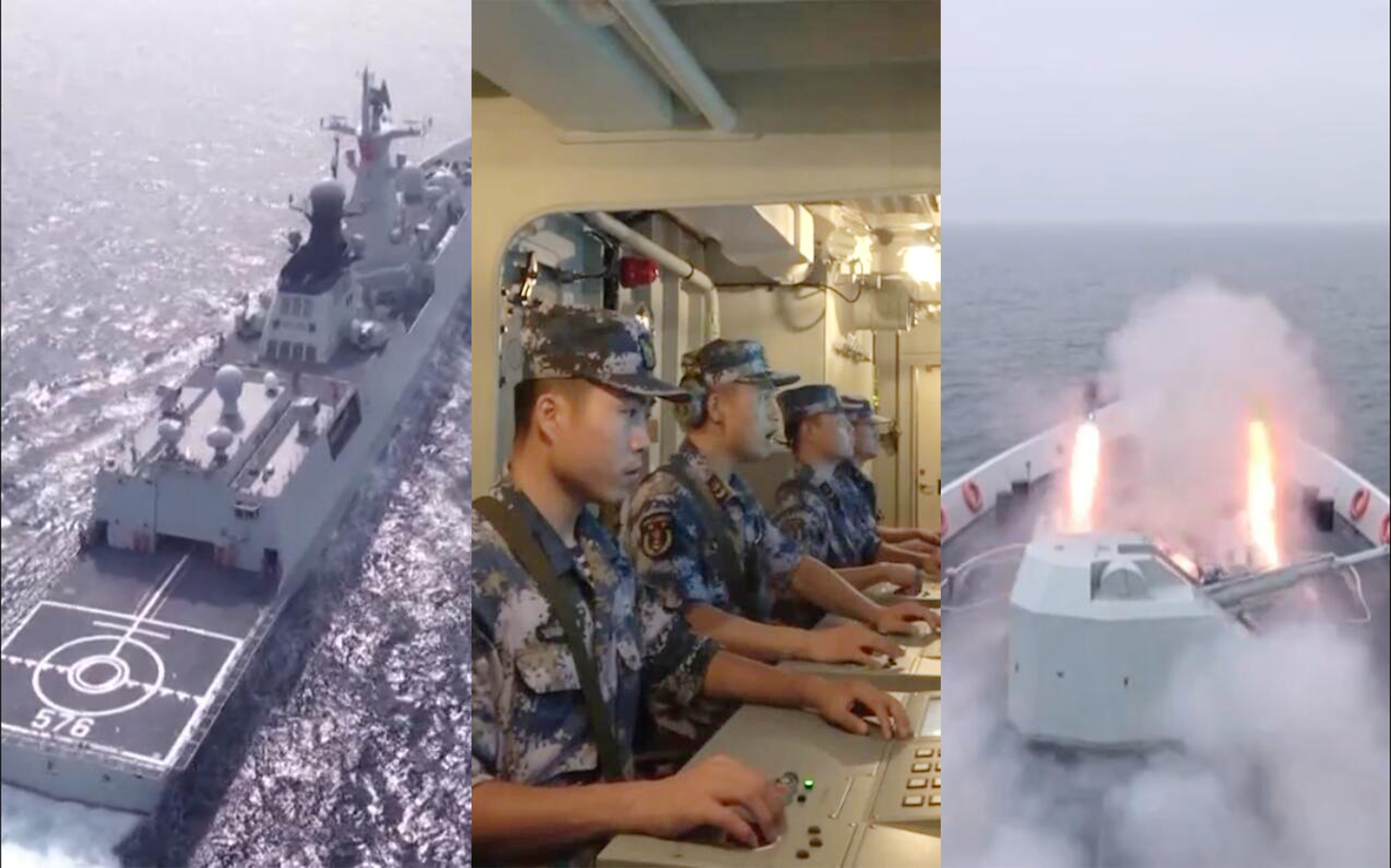 28日晚,北海艦隊披露一條18秒短視頻,展示了海軍某驅逐艦支隊近期在黃海進行多科目、全要素的實戰化訓練畫面。視頻顯示,伴隨作戰指令下達,054A型導彈護衞艦大慶艦(舷號576)火力全開,進行了主炮對海射擊,防空導彈垂髮,反潛火箭深彈、干擾彈發射等一系列實戰化訓練。畫面亦可見海面有其他驅護艦協同演練。