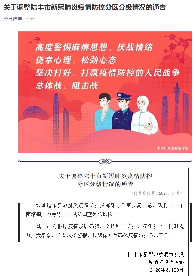 據廣東省陸豐市新型冠狀病毒肺炎疫情防控指揮部消息,陸豐市新型冠狀病毒肺炎疫情防控指揮部29日發布通告稱,經汕尾市新冠肺炎疫情防控指揮部辦公室批復同意,現將陸豐市南塘鎮風險等級由中風險調整為低風險。
