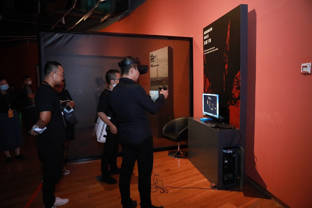 展映廳現場放擺著數台屏幕,每台屏幕前都配有一套頭戴式VR設備,觀眾帶上VR設備觀影即可身臨其境,由旁觀者變身劇中人。如影片《這裡》觀眾戴上VR設備後就可以上帝視角看到一間屋子裡跨越百年的歷史變遷故事;另一影片《夢之境》講述的是67歲的韓國婦女Yuri回憶自己8歲時在非軍事區的經歷,觀眾通過VR設備不僅能夠交互體驗她的冒險之旅,利用遊戲手柄還可以撫摸和觸碰眼前的花花草草和人。