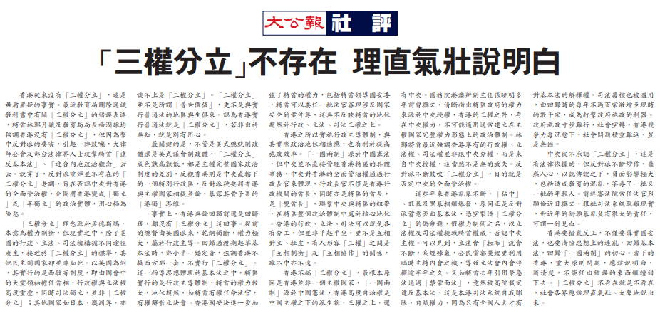 香港從來沒有「三權分立」,這是毋庸置疑的事實。最近教育局刪除通識教科書中有關「三權分立」的錯誤表述,特首林鄭月娥及教育局局長楊潤雄均強調香港沒有「三權分立」,但因為擊中反對派的要害,引起一陣鼓噪,大律師公會及部分法律界人士攻擊特首「違反基本法」、「迎合內地政治觀念」雲雲。說穿了,反對派重彈並不存在的「三權分立」老調,旨在否認中央對香港的全面管治權,企圖將香港變成「獨立」或「半獨立」的政治實體,用心極為險惡。