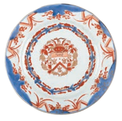 此外,陶工還會根據外商指定的造型、紋飾燒造瓷器。展覽中的青花礬紅彩描金徽章紋盤,就是定製的徽章紋瓷器。當時歐美皇室貴族等會把家族或組織的紋章燒製於瓷器上,進一步彰顯身份地位。18世紀歐洲成功燒製硬質瓷器並普及後,歐洲來華定製瓷器逐漸減少。