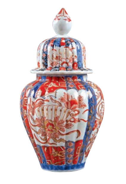 此次展覽中的青花礬紅彩花卉紋瓜棱蓋罐,就是日本有田地區生產的金襴手風格瓷器。方若素說,這件瓷器在瓜棱器型上使用釉下青花、釉上礬紅彩,不規則開光、摺扇紋等都是典型日本裝飾元素。「外銷到歐洲的日本伊萬里瓷多是大型的罐、瓶等陳設器,也從另一個角度反映當時日本在中國、朝鮮成熟技術基礎上,製瓷業迅速發展。」