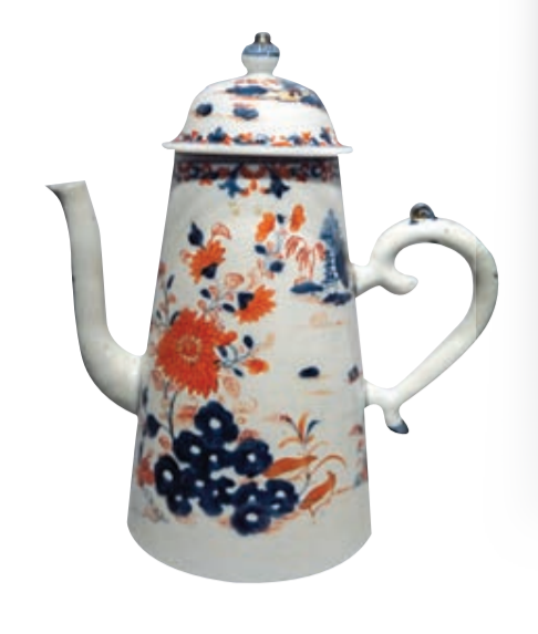 隨着茶葉、巧克力和咖啡先後傳入歐洲,以精巧的瓷器飲具待客成為一種時尚。成套茶具需求量大增,歐洲商人於是向景德鎮提供木模或其他材質的器具作為樣板,訂燒了大量造型特殊的飲具。青花礬紅彩描金花卉紋咖啡壺,就是景德鎮窰燒製的適應歐洲飲用咖啡需求的外銷瓷器。