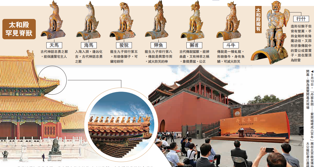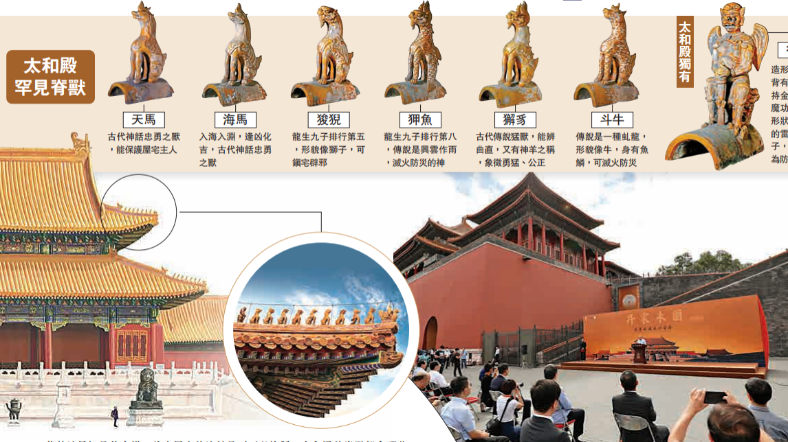 另外,紫禁城著名的脊獸也被搬到展廳。狄雅靜告訴大公報,這套小獸是康熙三十四年重建太和殿時的原件,每件小獸都有美好象徵寓意,尤其是最後一件──行什,只在太和殿出現。「雖然各個脊獸都展出過,但這還是太和殿的脊獸首次一起展出。」張傑說。
