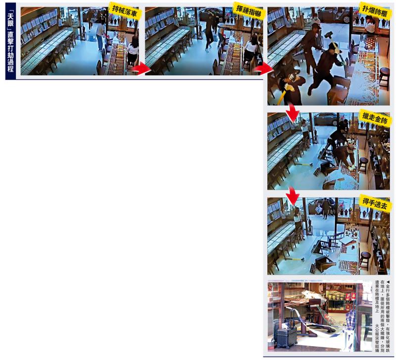 (大公報記者 周慶邦)黑暴加上新冠肺炎疫情夾擊,本港經濟陷入低谷,治安轉差,劫案頻生。三名持大鐵錘黑衣匪徒,昨晨闖入新蒲崗一間金行,用黃色大鐵錘撲爆飾櫃,並將整塊玻璃扯開,一分鐘內掠走至少七盤金飾,三賊得手即跳回黑色賊車逃去,金舖點算損失57萬元金飾。這是四個月內第四宗「鐵錘幫」打劫金行案。