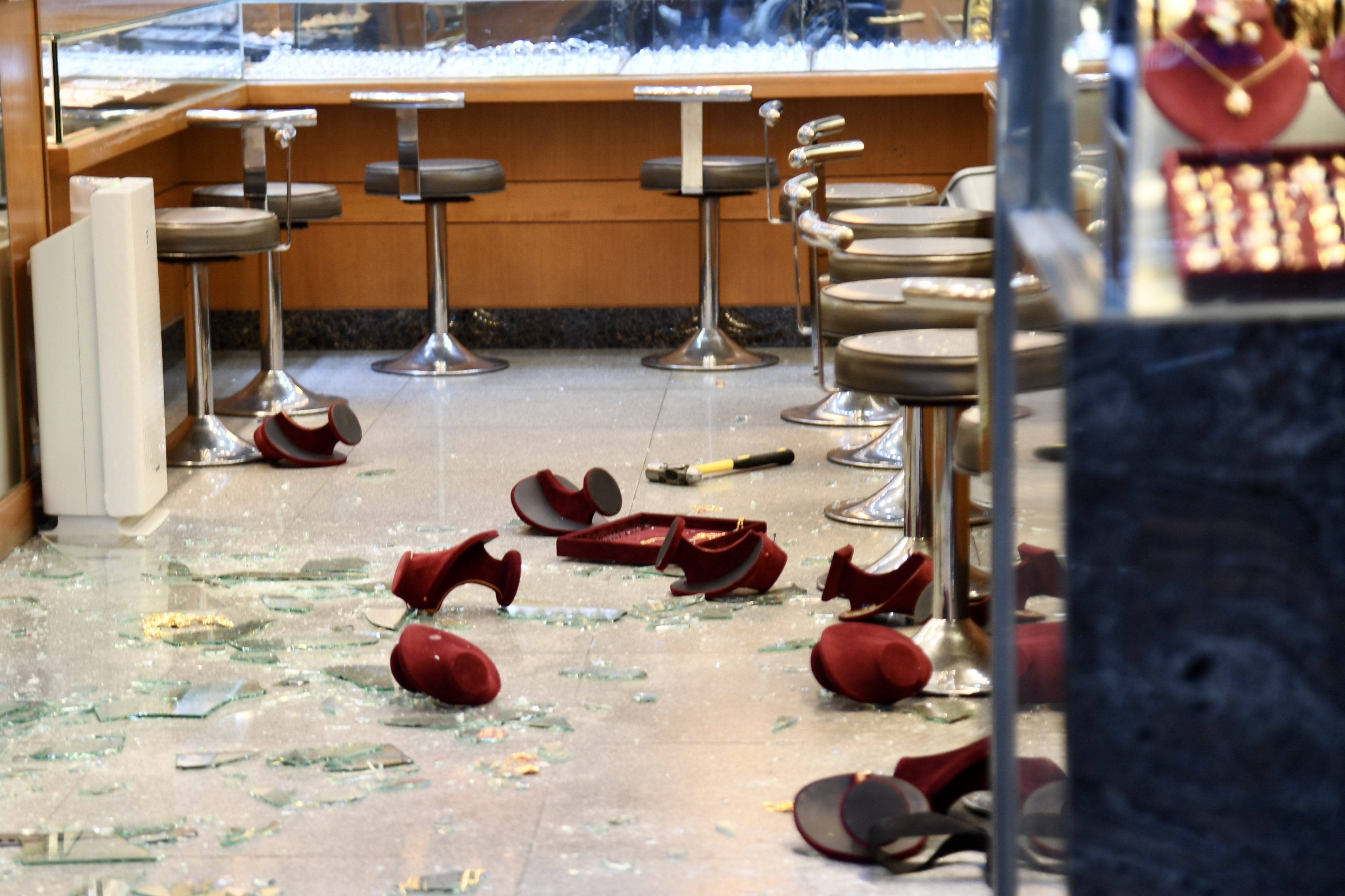 金行事後一片混亂,多個飾櫃被擊毀,一幅強化玻璃跌在地上,匪徒所用的兩個約一米長大鐵錘,分別遺棄在飾櫃及地上。經金舖點算後,損失金飾約值57萬元。