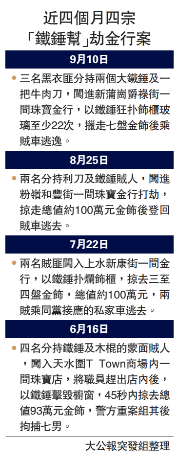 本港近月治安不靖,在過去四個月已發生四宗涉及「鐵錘幫」的行劫案,對上一次發生在八月尾,兩名分持鐵錘及利刀賊匪闖進粉嶺和豐街一間珠寶店,以鐵錘撲爆飾櫃玻璃,擸走約值100萬元金飾;另外在七月尾,上水新豐街一間金行亦被兩鐵錘賊打劫,由於該兩案賊人數目及手法均近似,警方不排除是賊人食髓知味再次犯案。