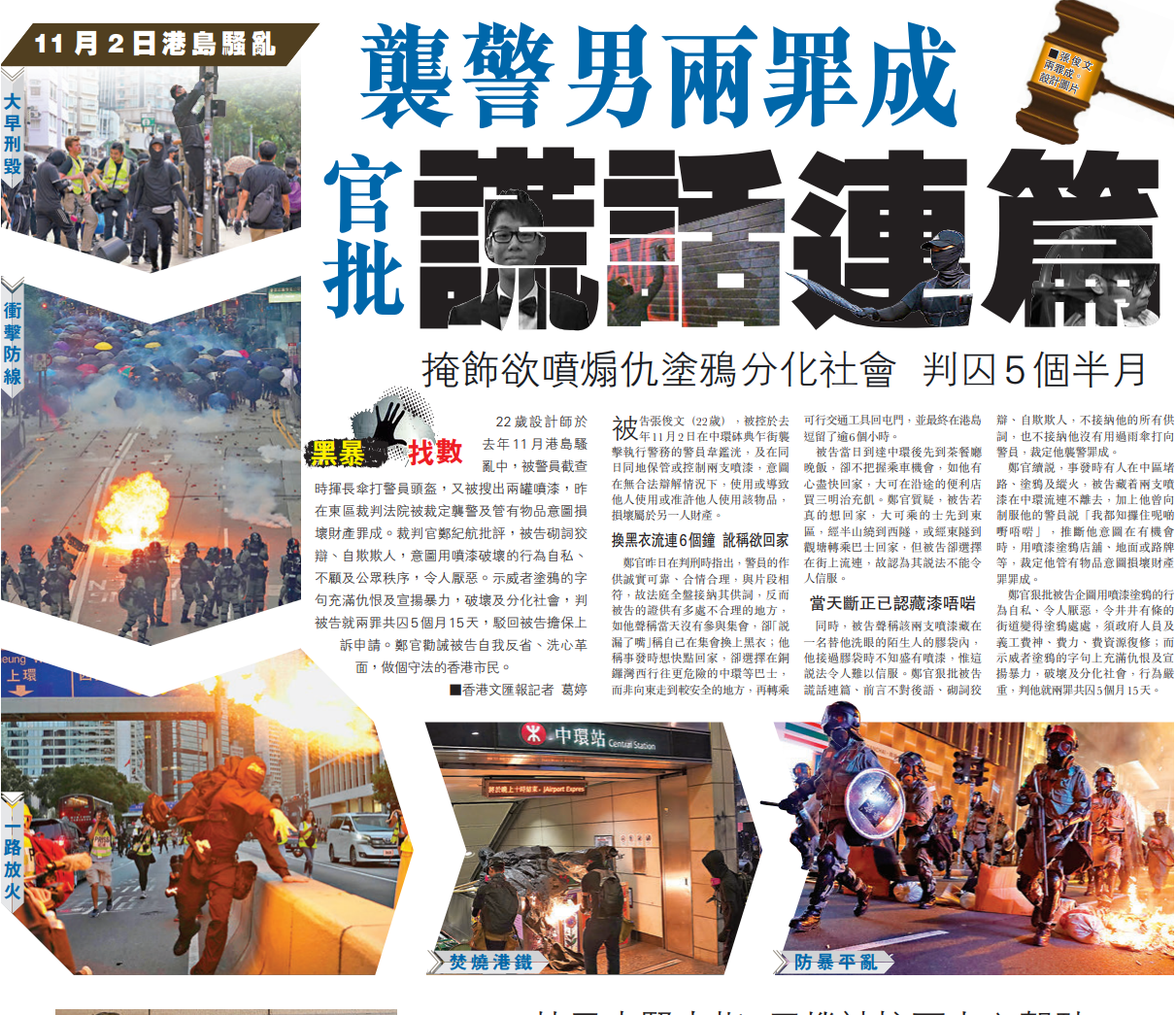 同時,被告聲稱該兩支噴漆藏在一名替他洗眼的陌生人的膠袋內,他接過膠袋時不知盛有噴漆,惟這說法令人難以信服。鄭官狠批被告謊話連篇、前言不對後語、砌詞狡辯、自欺欺人,不接納他的所有供詞,也不接納他沒有用過雨傘打向警員,裁定他襲警罪成。