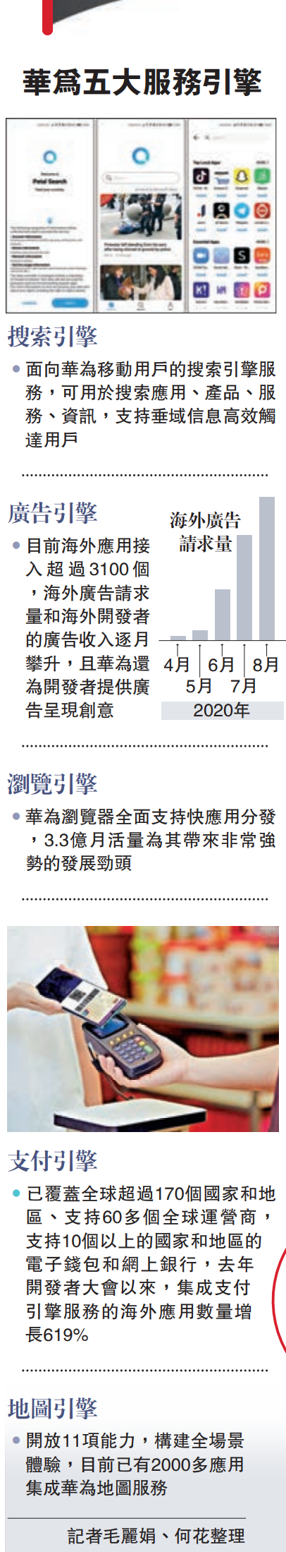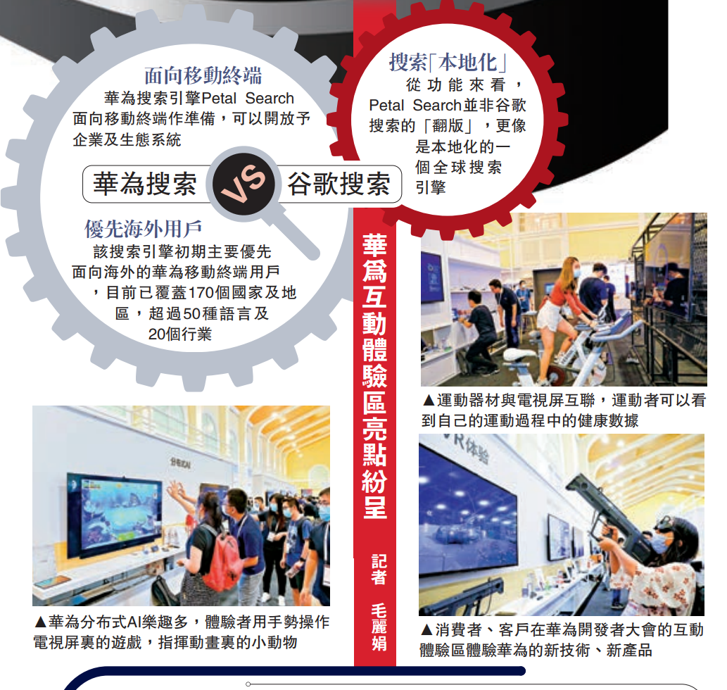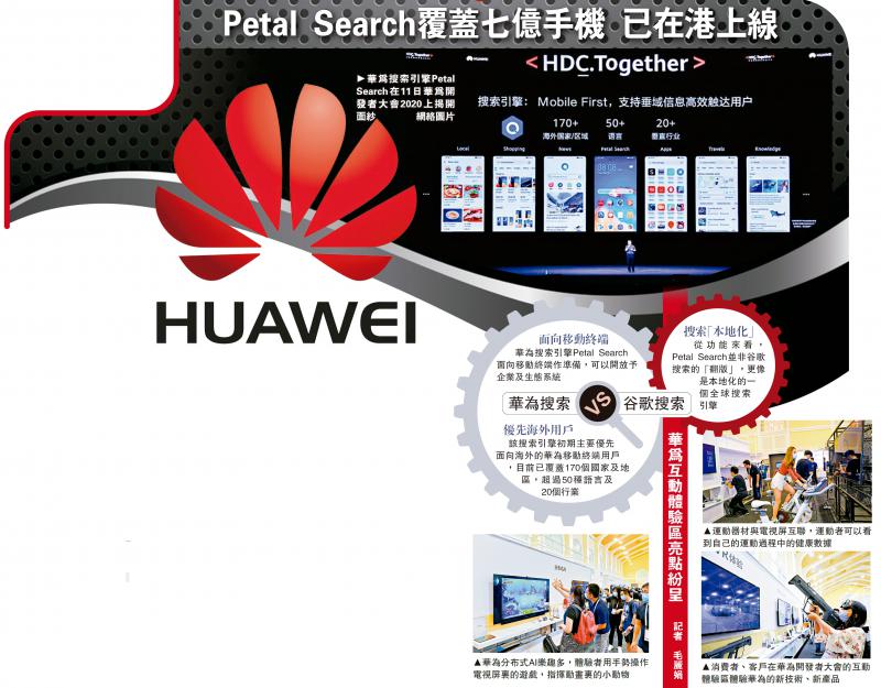 (大公報記者 毛麗娟、何花 東莞報道)備受關注的華為搜索Petal Search在11日華為開發者大會2020上揭開面紗,該搜索引擎有望打破Google壟斷全球搜索市場的格局,成為全球第2大搜索引擎。華為消費者業務雲服務總裁張平安介紹,Petal Search初期主要優先面向海外的華為移動終端用戶,目前已在包括香港在內的全球170多個國家和地區上線使用,支持全球50多種語言,適用於20多個垂直行業,覆蓋7億手機用戶。
