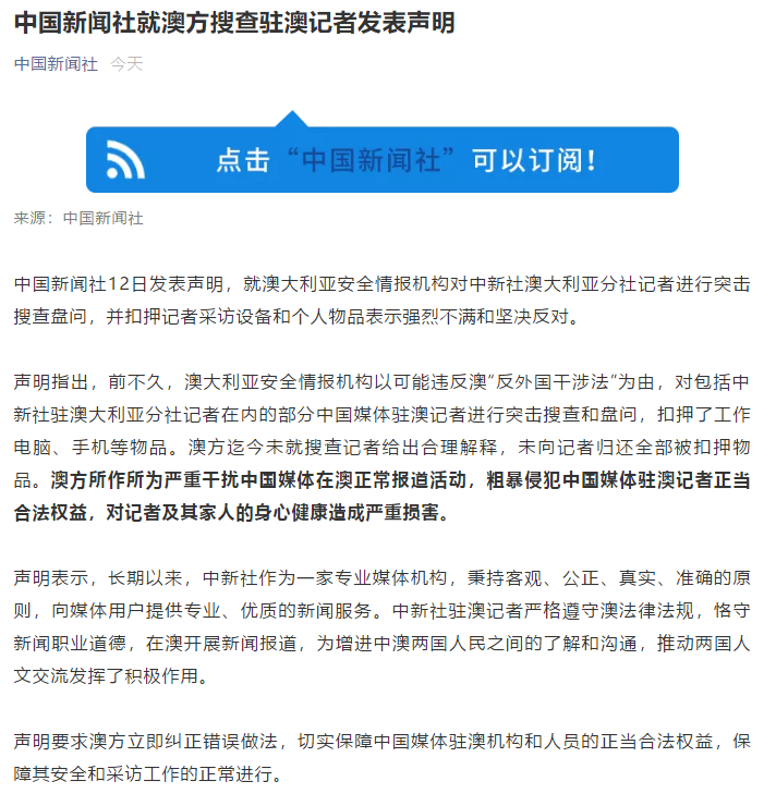 中國新聞社12日發表聲明,就澳大利亞安全情報機構對中新社澳大利亞分社記者進行突擊搜查盤問,並扣押記者採訪設備和個人物品表示強烈不滿和堅決反對。