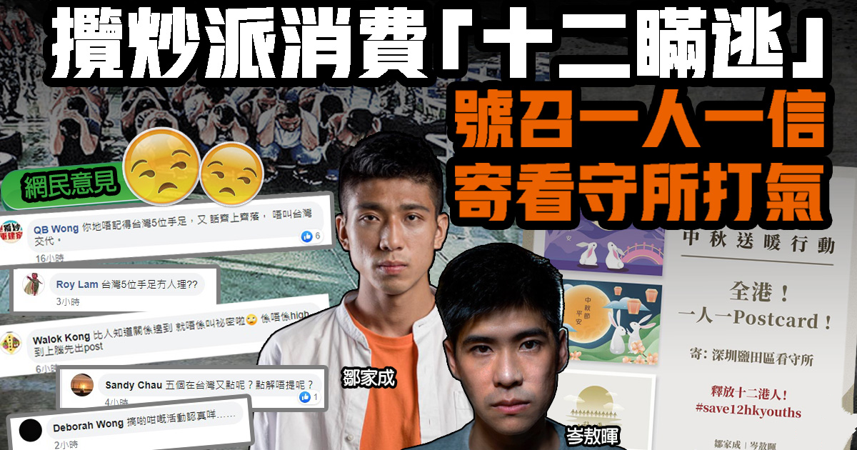 據大公文匯全媒體報道,「十二瞞逃」因非法越境被內地扣押,攬炒派卻在未經司法程序之下妄言要內地「放人」。荃灣區議員岑敖暉和新界東「初選」出線嘅「素人」鄒家成發起全港「一人一postcard」行動,指中秋節將至,希望給關押在深圳鹽田看守所的12人送暖,又話要為其中3名於9月生日的被扣留人士送上生日祝福。