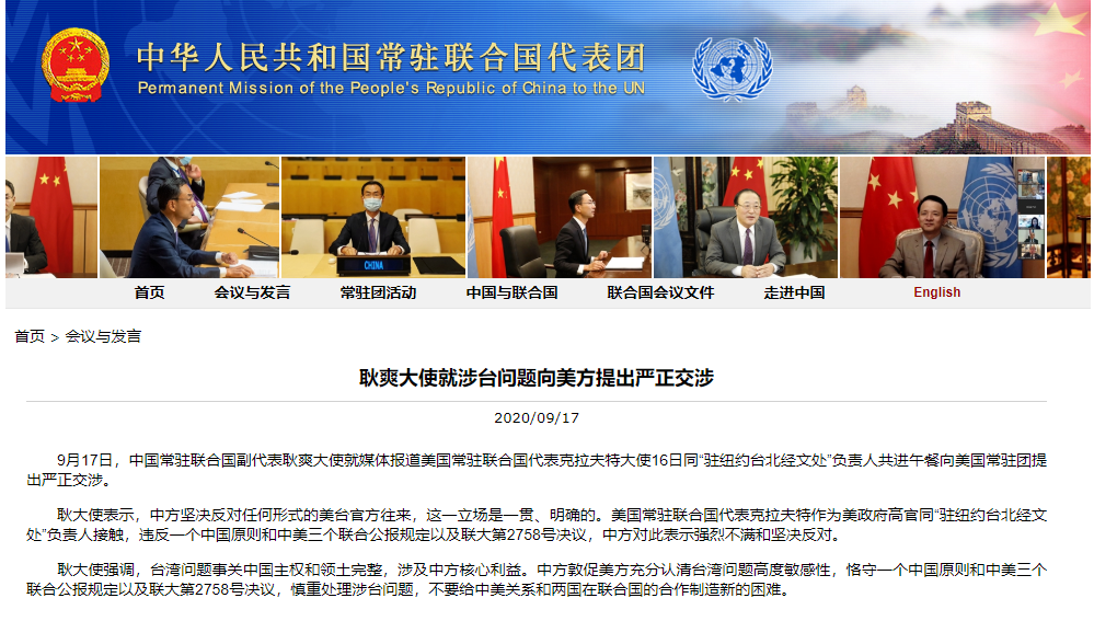 9月17日,中國常駐聯合國副代表耿爽大使就媒體報道美國常駐聯合國代表克拉夫特大使16日同「駐紐約台北經文處」負責人共進午餐向美國常駐團提出嚴正交涉。