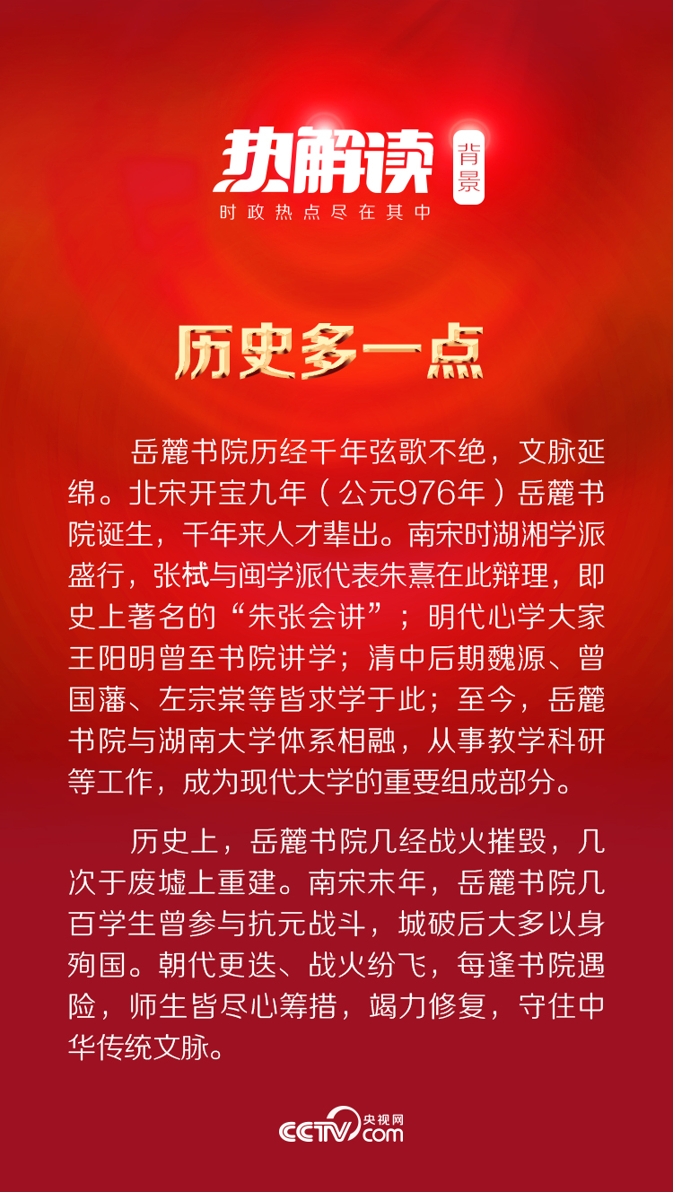 離開校園時,習近平總書記深情地對師生們說:「岳麓書院一直是我有牽掛,這個學院在我們的傳統文化中的地位、影響,我還是很有感觸的。」總書記特別剖析了「惟楚有材,於斯為盛」這副古聯背後的深意:「於斯為盛,我的體會一個就是我們湖南人才濟濟,代有才人出啊,有報效祖國的棟樑之材。再有呢,於斯為盛這個『斯』,是指的這個時代。明年是第十四個『五年規劃』開局之年,是我們開啟『第二個百年』新徵程的起點。這是一個英雄輩出的時代,你們這個年紀正當其時。」