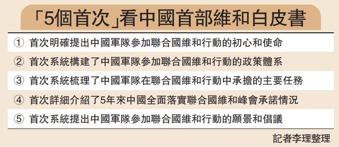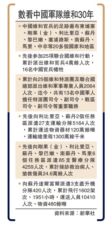 (大公報記者 李理北京報道)國新辦18日發布首部《中國軍隊參加聯合國維和行動30年》白皮書指出,中國軍隊為世界和平出征,30年來足跡遍布20多個國家和地區,中國軍隊先後參加25項聯合國維和行動,累計派出維和官兵4萬餘人次,以血肉之軀築「生命防線」,16名中國官兵為了和平事業獻出了寶貴生命。國防部新聞發言人任國強大校表示,中國將始終做維護世界和平的堅定力量。進入新時代,中國軍隊以服務構建人類命運共同體為目標,加大對聯合國維和行動的支持和參與力度,為衝突地區實現和平發展帶去更多信心和希望。