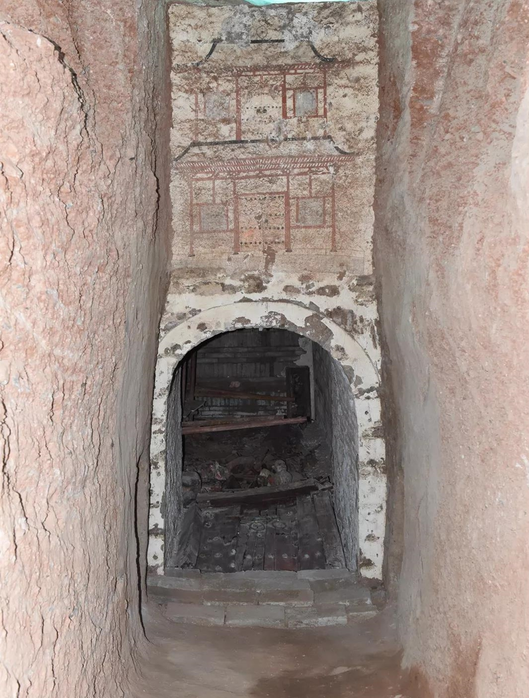 據介紹,慕容智墓壁畫主要繪製於甬道和墓室。甬道為磚砌的雙券結構,券頂上有雙層磚錯縫平砌而成的照牆,上繪有壁畫,內容主要為雙層門樓形象。墓室近方形,盝頂。甬道及墓室內繪有壁畫,局部保存較好者可見下端壁牆上主要為人物形象圖,券頂部分繪有星象圖。其中《門樓圖》是該墓壁畫中面積最大、保存最完整的一幅壁畫。這幅大型壁畫繪製於墓室甬道前端墓門上方的門牆正面,為彩繪的磚木結構門樓圖,繪畫手法寫實、生動、直觀,兩層門樓疊加的結構亦非常罕見,充分顯示了墓主顯赫的地位,以及當時建築的形制結構。另外一副月亮白描墨線壁畫呈圓形,不僅有桂花樹和月兔,同時還有一個高腳酒杯,形象描繪了當時人們對月宮的美好想像。