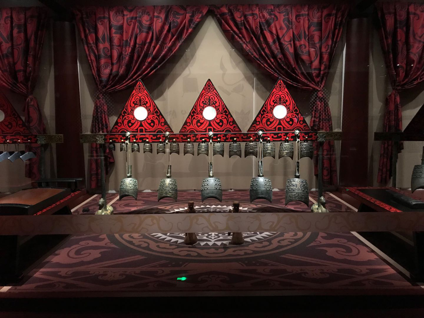 「金色海昏」展廳內,以夯土的「黃」、漆器的「紅」與「黑」為主色調,展陳手法上採用主題式設計手法,復原了氣勢雄壯的西漢王侯出行車馬儀仗,還有恢弘大氣的禮樂場景。獨家四層展櫃設計,立體展示了劉賀棺槨出土文物的擺放次序;「三維動畫」生動解說墓室結構;動畫影片介紹馬車形制與當盧紋樣;「透明屏+展櫃」直觀演示蒸煮器結構與使用方法。通過多媒體演示沙盤、沉浸式3D畫面與舞檯燈光結合,還可讓觀眾三維漫遊紫金城,通過觸摸屏體驗「築紫金城」。