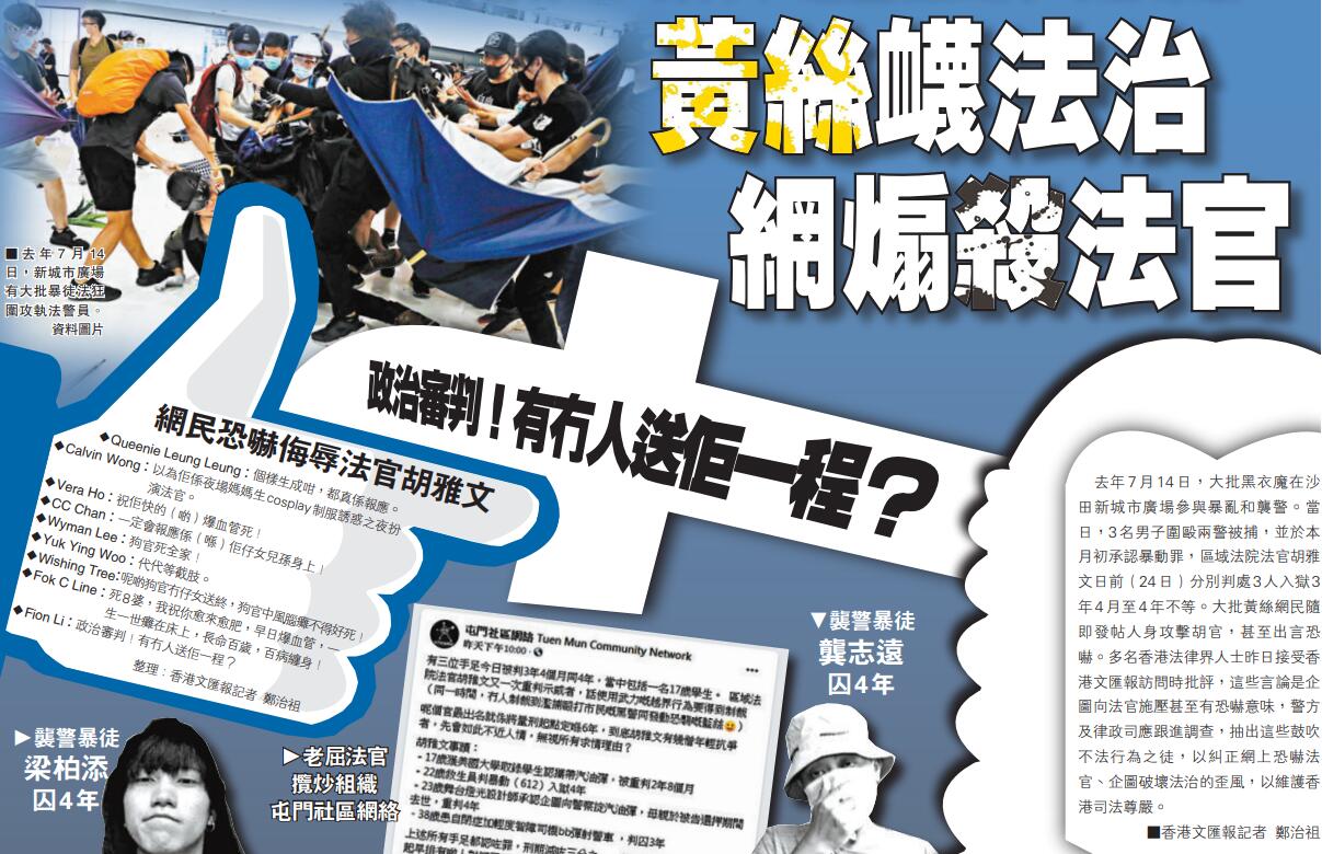 (香港文匯報記者 鄭治祖)去年7月14日,大批黑衣魔在沙田新城市廣場參與暴亂和襲警。當日,3名男子圍毆兩警被捕,並於本月初承認暴動罪,區域法院法官胡雅文日前(24日)分別判處3人入獄3年4月至4年不等。大批黃絲網民隨即發帖人身攻擊胡官,甚至出言恐嚇。多名香港法律界人士昨日接受香港文匯報訪問時批評,這些言論是企圖向法官施壓甚至有恐嚇意味,警方及律政司應跟進調查,抽出這些鼓吹不法行為之徒,以糾正網上恐嚇法官、企圖破壞法治的歪風,以維護香港司法尊嚴。