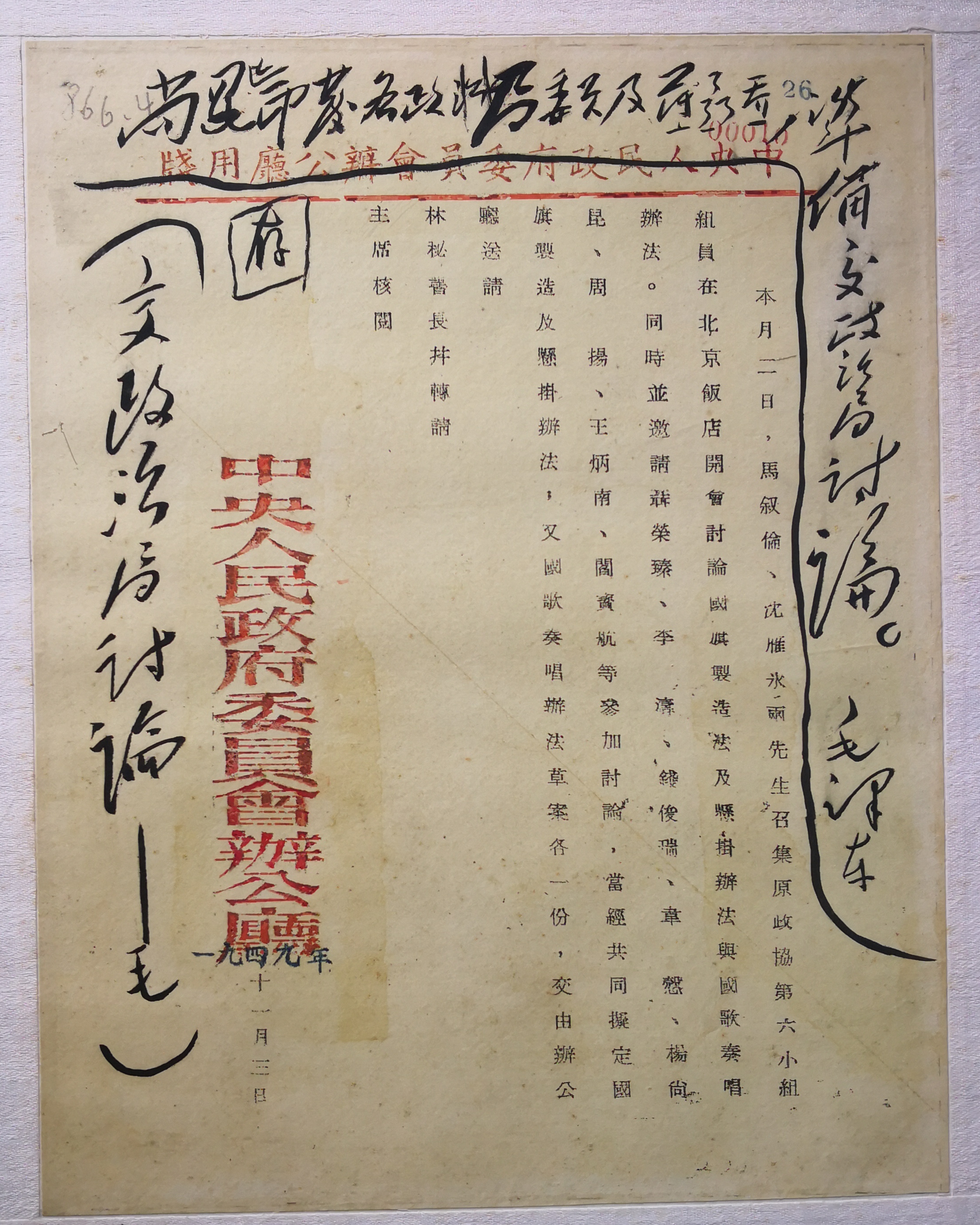 1949年9月25日晚,毛澤東、周恩來在中南海豐澤園召開座談會,聽取關於國旗、國徽、國歌、紀年、國都問題的意見。座談會上,馬敘倫提議用《義勇軍進行曲》暫代國歌。許多委員表示贊成,一部分委員提出需要修改歌詞。周恩來表示,就用原來的歌詞,他說:「這樣才能鼓動情感。修改後,唱起來就不會有那種情感。」最後,毛澤東拍板,歌詞不改,與會者一致贊同,在中華人民共和國的國歌未正式制定前,以《義勇軍進行曲》為代國歌。毛澤東、周恩來和與會者一起合唱《義勇軍進行曲》,座談會在這首激盪人心的歌曲中結束。