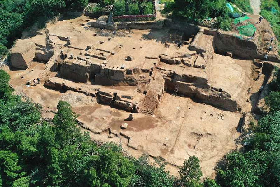 據介紹,朝元閣遺址位於陝西西安臨潼區驪山西繡嶺第三峰峰頂北端,海拔約697米。此次發掘面積共1550平方米,全面揭露了夯土高台、主體建築、東西踏道、北廊房、東西廊房、西側附屬廊房,釐清了遺址的層位關係。同時還發現了疊壓在唐代遺址上方的晚期建築基址,探明了唐代夯土的範圍與深度,清理了殘存的唐代建築木構件,並對遺址開展了航空測繪、激光掃瞄等精細測繪工作。