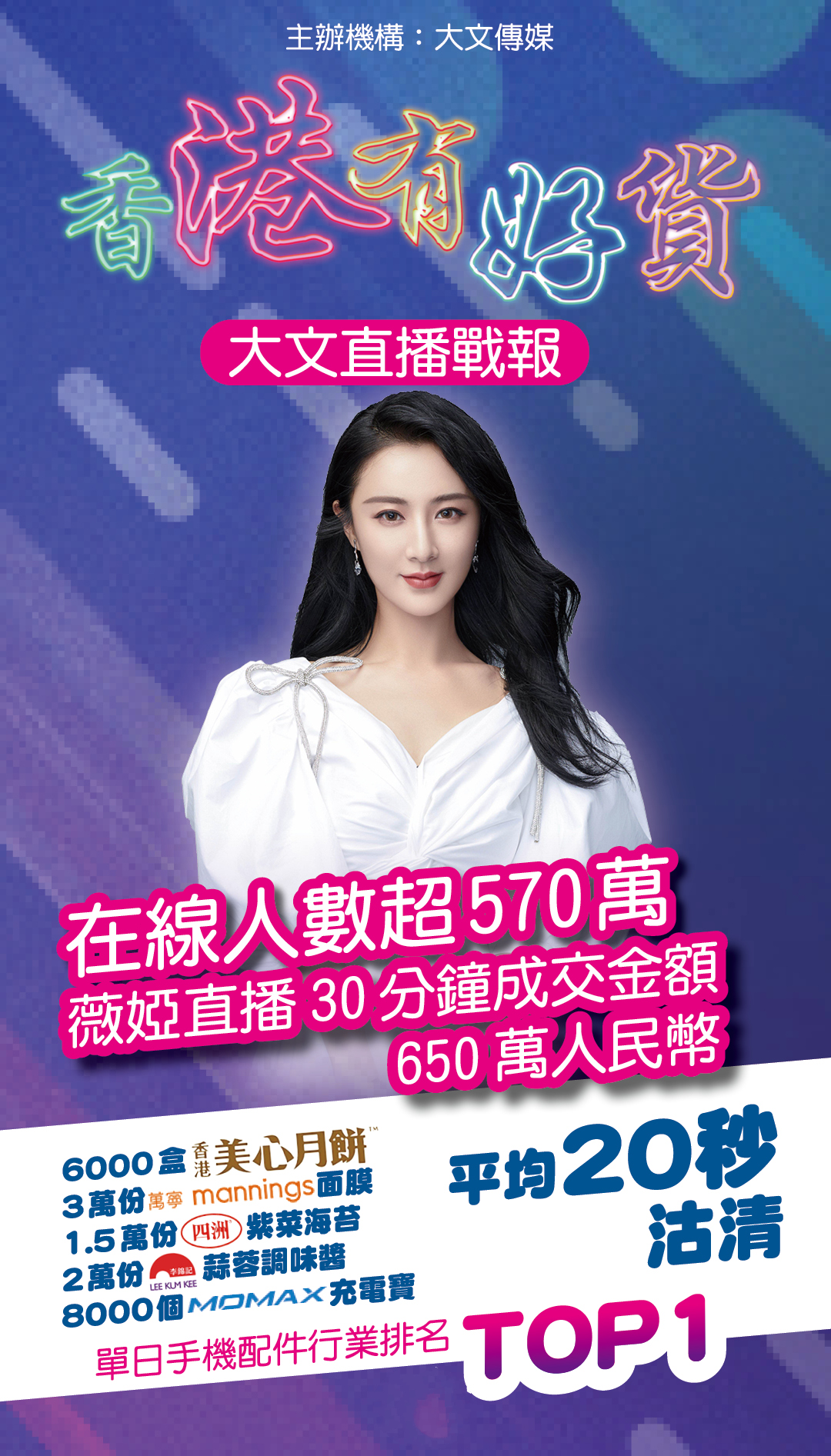 直播剛進行半小時,在線粉絲已達500多萬人,網友對港貨的支持非常熱烈,以致大公文匯傳媒集團旗下的4個網站、3個APP和5個微博被「擠爆」,薇婭直播間也崩潰了一個服務器。