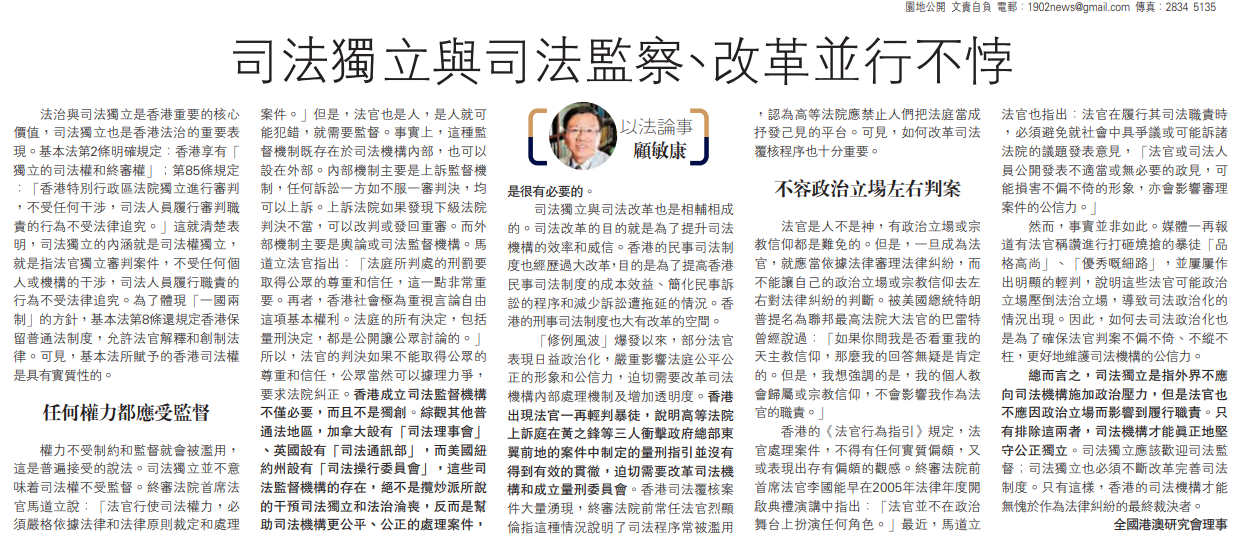 權力不受制約和監督就會被濫用,這是普遍接受的說法。司法獨立並不意味着司法權不受監督。終審法院首席法官馬道立說:「法官行使司法權力,必須嚴格依據法律和法律原則裁定和處理案件。」但是,法官也是人,是人就可能犯錯,就需要監督。事實上,這種監督機制既存在於司法機構內部,也可以設在外部。內部機制主要是上訴監督機制,任何訴訟一方如不服一審判決,均可以上訴。上訴法院如果發現下級法院判決不當,可以改判或發回重審。而外部機制主要是輿論或司法監督機構。馬道立法官指出:「法庭所判處的刑罰要取得公眾的尊重和信任,這一點非常重要。再者,香港社會極為重視言論自由這項基本權利。法庭的所有決定,包括量刑決定,都是公開讓公眾討論的。」所以,法官的判決如果不能取得公眾的尊重和信任,公眾當然可以據理力爭,要求法院糾正。香港成立司法監督機構不僅必要,而且不是獨創。綜觀其他普通法地區,加拿大設有「司法理事會」、英國設有「司法通訊部」,而美國紐約州設有「司法操行委員會」,這些司法監督機構的存在,絕不是攬炒派所說的干預司法獨立和法治淪喪,反而是幫助司法機構更公平、公正的處理案件,是很有必要的。