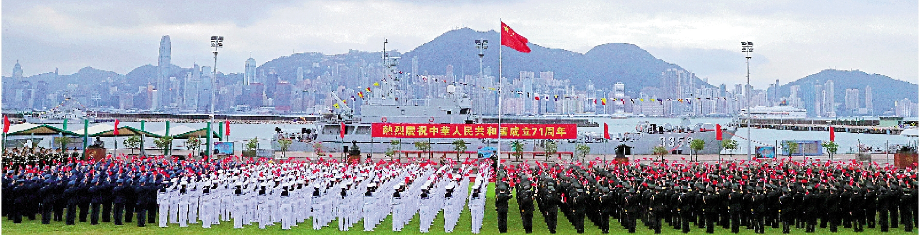 清晨7時許的維多利亞港昂船洲軍營,96名駐港部隊三軍儀仗隊隊員組成的護旗方隊邁着穩健的步伐護衛國旗莊嚴入場。「升國旗!奏國歌!」伴隨着升國旗儀式開始,從大帽山下到維港之畔,從空軍場站到海軍基地,在赤柱、新圍、九龍、石崗遍布全港的座座軍營,一面面五星紅旗迎風招展,標定出人民軍隊的神聖哨位。