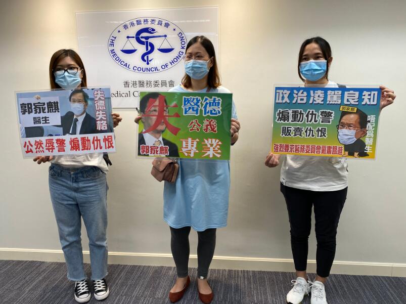 陳小姐亦批評,「郭家麒侮辱警察是『一堆綠色物體』,實在有損本港醫生崇高的職業形象,作為香港市民,我們敦促醫務委員會嚴肅處理郭家麒事件。」