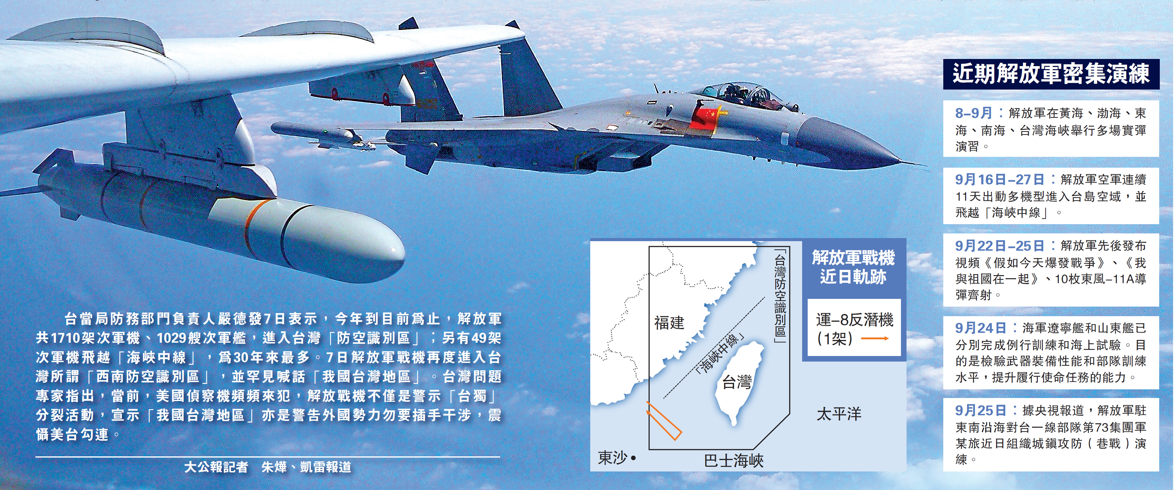 (大公報 記者 朱燁、凱雷)台當局防務部門負責人嚴德發7日表示,今年到目前為止,解放軍共1710架次軍機、1029艘次軍艦,進入台灣「防空識別區」;另有49架次軍機飛越「海峽中線」,為30年來最多。7日解放軍戰機再度進入台灣所謂「西南防空識別區」,並罕見喊話「我國台灣地區」。台灣問題專家指出,當前,美國偵察機頻頻來犯,解放戰機不僅是警示「台獨」分裂活動,宣示「我國台灣地區」亦是警告外國勢力勿要插手干涉,震懾美台勾連。