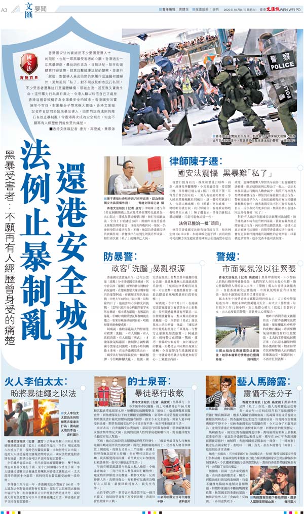 (香港文匯報 記者 唐方、高俊威、蕭景源)香港國安法的實施是不少愛國愛港人士的期盼,也是一眾黑暴受害者的心願。香港過去一年黑暴肆虐,暴徒胡作非為、目無法紀,除在街頭隨意打砸搶燒,肆意攻擊維護法紀的警察,並進行「起底」對警務人員及他們的家屬作出滋擾和威嚇外,更無差別「私了」對不同政見的市民行私刑,不少受害者遭暴徒打至遍體鱗傷、頭破血流,甚至喪失寶貴生命。這些暴力行為無日無之,令港人難以相信自己正處身香港這個曾被稱許為全球最安全的城市。香港國安法實施至今百日,對黑暴分子帶來極大震懾,香港文匯報記者昨日訪問多位黑暴受害人,他們均認為法例的推行有效止暴制亂,令香港再次成為安全城市,坦言不願再有人經歷他們曾身受的痛楚。