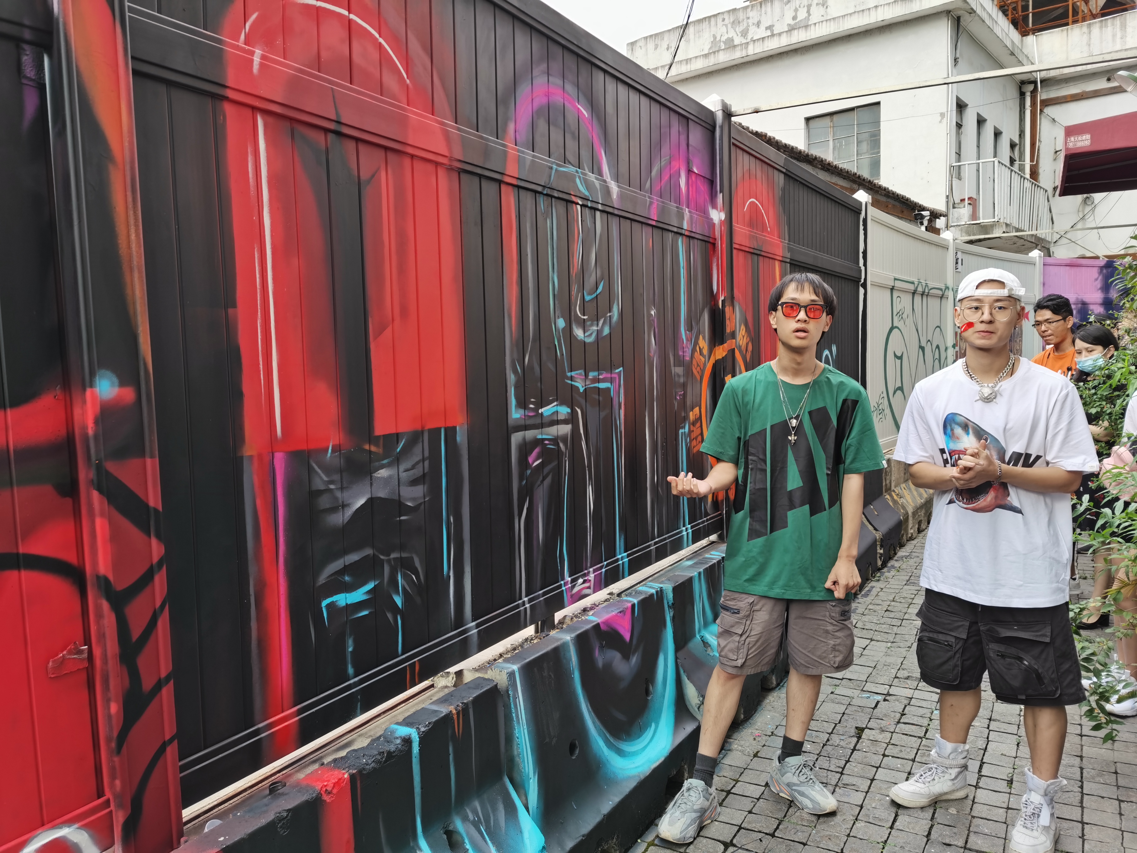 在交談中記者還發現,和劉慶元一樣,這批年輕藝術家很多都已經在莫乾山路這一代活躍多年。95後本土青年潮流藝術家組合CA$Ha說,這條街曾是他們的展廳。國內塗鴉界大神級人物Rula從事塗鴉已有13年。對於能夠在新的天地從事創作,他感覺非常有意義。此次他新創作了名為《打破&;重組》的塗鴉,讓化身粒子碎片的顏色與線條重新連接組合,呈現出一種新的塗鴉藝術形態。