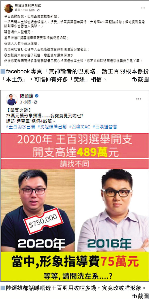 帖文仲話,王百羽曾經參加被攬炒派稱為「小圈子選舉」嘅選舉委員會界別分組選舉,仲成功當選選舉委員,佢喺2017年更獲選為第十三屆港區全國人大代表選舉團成員,真係點睇都唔似「本土派」,所以佢今次參加「飯民」大台小圈子「初選」,只係混水摸魚撈油水,可惜好多「黃絲」都信佢係「本土派」。