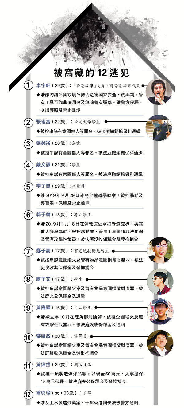 12名港暴分子於8月23日早上在西貢布袋澳乘快艇偷渡去台灣,在內地海域被廣東海警截獲。該12名逃犯中有10人分涉暴動、槍支炸藥及串謀傷人等案被檢控,其後棄保潛逃,上月已先後被香港法庭沒收保釋金及發出拘捕令。快艇上餘下兩人包括涉干犯國安法的港獨分子李宇軒及姓喬女黑暴。