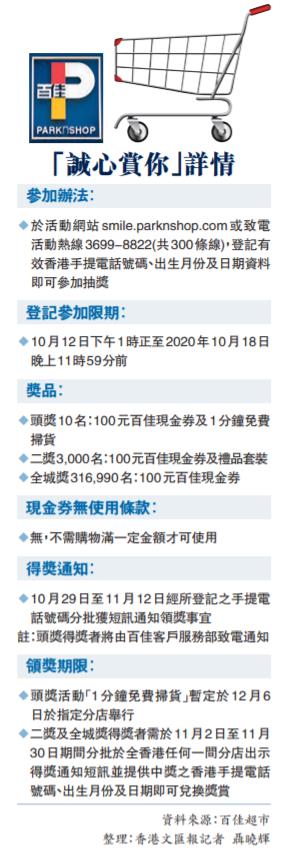 百佳繼早前宣布有關惠及弱勢社群的現金食物券計劃後,昨日公布推出「誠心賞你」大抽獎,並指已獲政府接納有關回饋市民的方案。市民不用到百佳消費,只需由今天起至本月18日期間於百佳活動網站smile.parknshop.com或致電活動熱線3699-8822(共300條線)登記簡單資料,包括提供有效香港手提電話號碼、出生月份及日期,不需要提供姓名及身份證號碼即可參加抽獎。