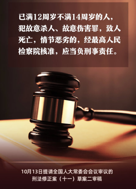 刑法修正案(十一)草案13日提請十三屆全國人大常委會進行二次審議。草案規定,已滿十二周歲未滿十四周歲的人,犯故意殺人、故意傷害罪,致人死亡,情節惡劣的,經最高人民檢察院核准,應當負刑事責任。對於姦淫幼女罪,草案指出,對姦淫不滿十周歲的幼女或者造成幼女傷害等嚴重情形明確適用更重刑罰。