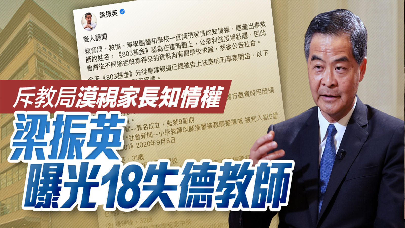 大公文匯全媒體報道:全國政協副主席、前行政長官梁振英及其創立的「803基金」早前申請司法覆核,要求教育局公開被裁定專業操守失當的教師資料及學校名稱,但教局遲遲未有動靜。今日(13日)梁振英在社交平台以《聳人聽聞》為題發文,直斥教育局、教協、辦學團體和學校一直漠視家長的知情權,隱藏出事教師的姓名,他還在文後詳列18名涉襲警、暴動及非法集結等罪的教師及補習老師的姓名及其任教學校。