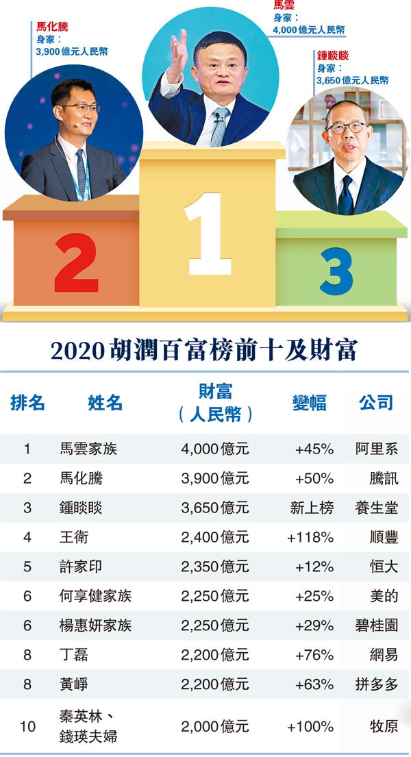 (香港文匯報記者 孔雯瓊 上海報道)昨天發布的中國「2020胡潤百富榜」見證了資本市場造富的神話,農夫山泉(9633)創始人鍾睒睒,第一次登榜就以3,650億元(人民幣,下同)排名第三,成為今年最大的「黑馬」。阿里巴巴(9988)創始人馬雲家族,以4,000億元的財富第四次蟬聯中國首富,財富也比去年上漲45%。榜單顯示出,疫情下中國經濟仍在快速增長,中國企業家創造財富的速度在今年達到了一個歷史新高。