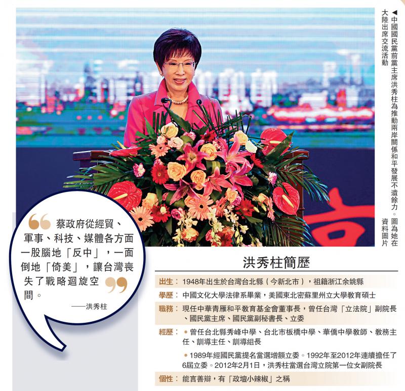 (大公報記者 何德花)民進黨蔡英文政府自2016年5月上台以來拒不承認體現一中原則的「九二共識」,而且走「親美抗中」路線,尤其近來美台勾連頻繁,嚴重破壞兩岸關係,導致台海局勢升溫。大公報記者最近就兩岸局勢熱點獨家專訪了中國國民黨前黨主席洪秀柱。洪秀柱指出,民進黨「反中」政策對台灣的影響是全面性的:文化「去中」,製造世代認同差異,徒增台灣社會矛盾;經濟與產業鏈「脫中」,讓台灣經濟陷入進退維谷的困境;在區域安全上「圍中」,降低兩岸互信;在國安法上「恐中」,製造寒蟬效應;「憲政離中」,分離主義則會為國家民族復興埋下動亂禍源。