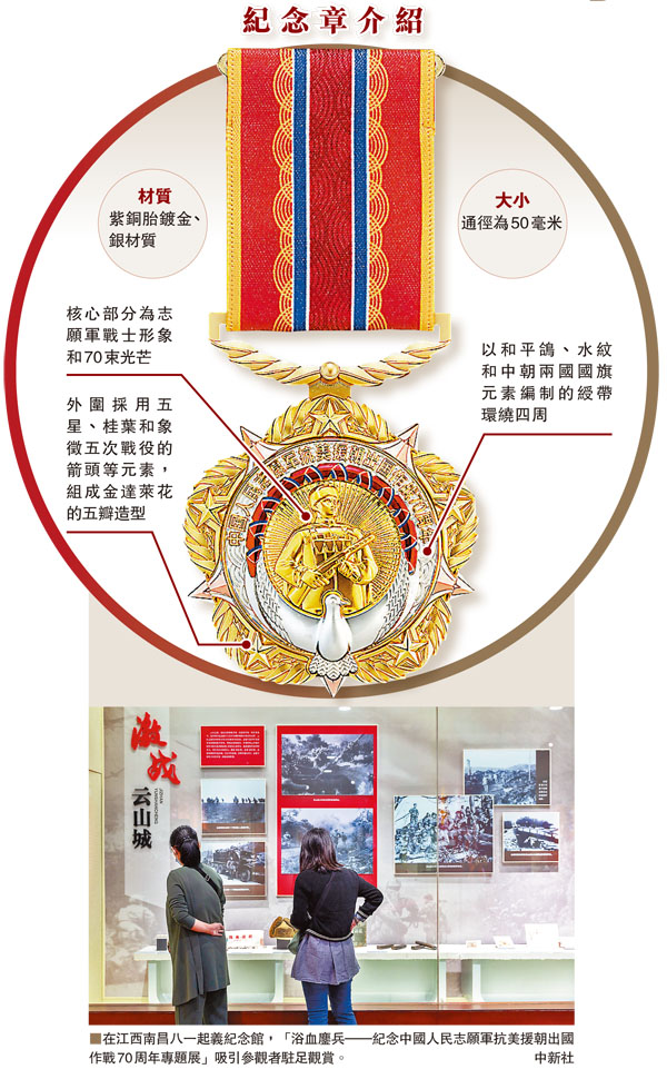 紀念章使用紫銅胎鍍金、銀材質,通徑為50毫米。紀念章核心部分為志願軍戰士形象和70束光芒,以和平鴿、水紋和中朝兩國國旗元素編制的綬帶環繞四周,外圍採用五星、桂葉和象徵五次戰役的箭頭等元素,組成金達萊花的五瓣造型,象徵中國人民志願軍抗美援朝出國作戰70周年,寓意偉大的抗美援朝戰爭是保衛和平、反抗侵略的正義之戰,偉大的抗美援朝精神永遠是中國人民的寶貴財富,彰顯出中國不畏強敵、維護世界和平、構建人類命運共同體的堅定決心和信心。