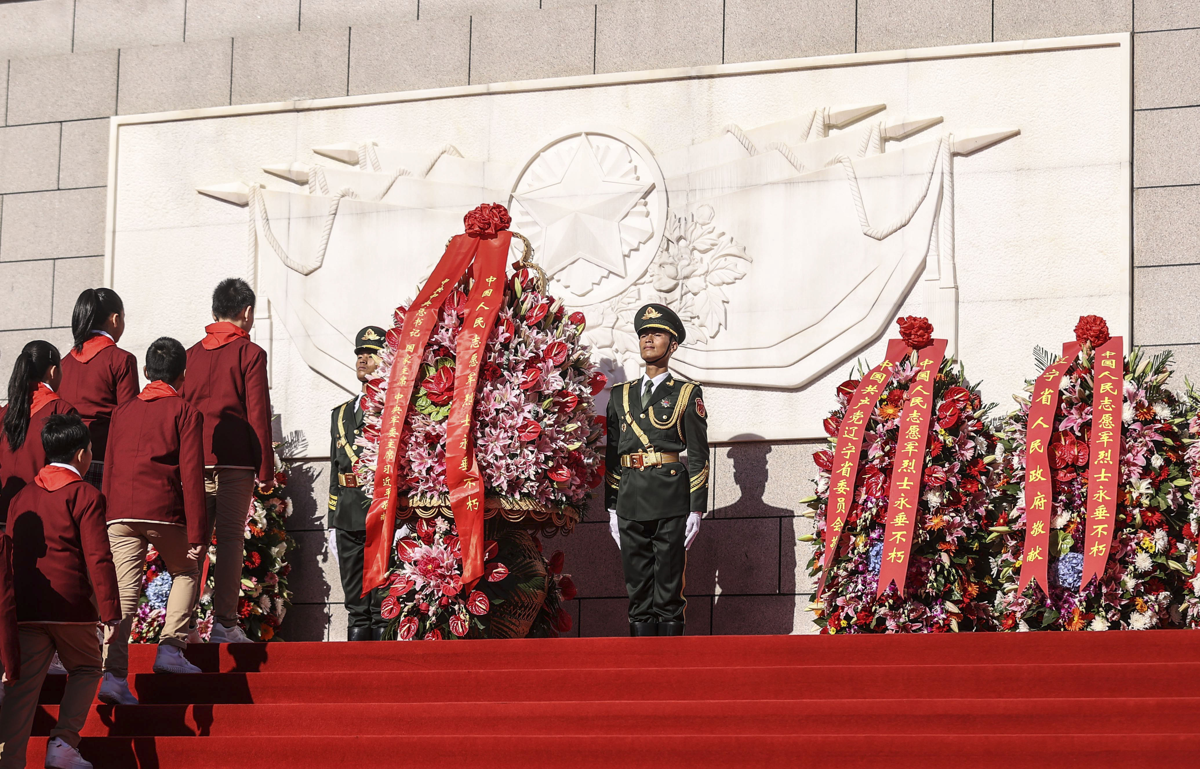 中共中央政治局委員、中央軍委副主席張又俠,中央黨政軍有關部門、遼寧省委和省政府、駐沈解放軍和武警部隊負責同志,參加過抗美援朝的志願軍老戰士、老同志代表和烈士家屬代表,解放軍和武警部隊官兵代表,國家機關工作人員,各界群眾代表等面向烈士紀念碑肅立,寄託對中國人民志願軍烈士的深切緬懷和崇高敬意。隨後,全場人員瞻仰了烈士紀念碑並向五大烈士墓敬獻了鮮花。