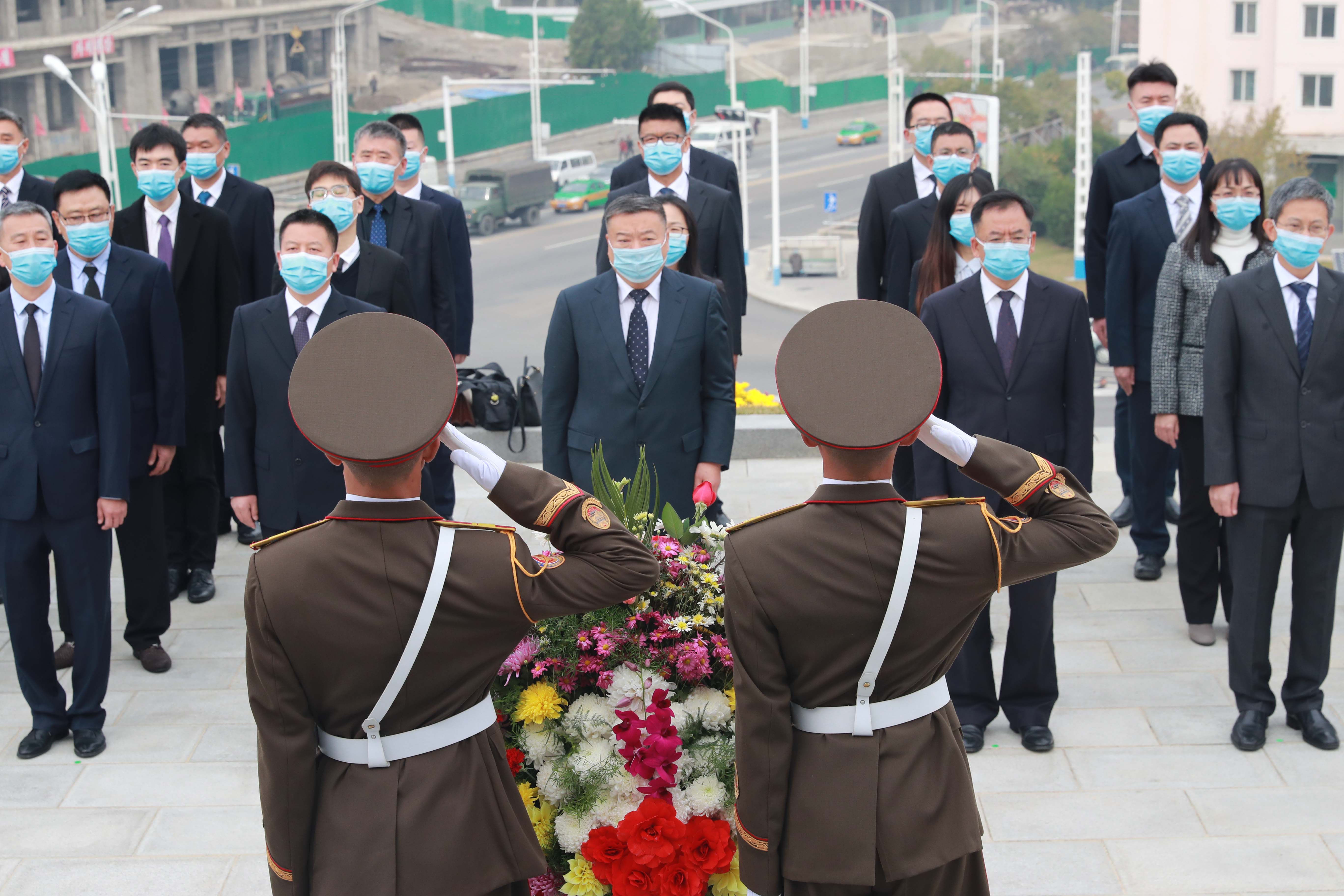 10月21日,以中共中央總書記、國家主席、中央軍委主席習近平名義向朝鮮平壤中朝友誼塔、檜倉中國人民志願軍烈士陵園敬獻花籃儀式先後舉行,我國駐朝鮮大使李進軍率全體館員及其他在朝中方人員代表出席。
