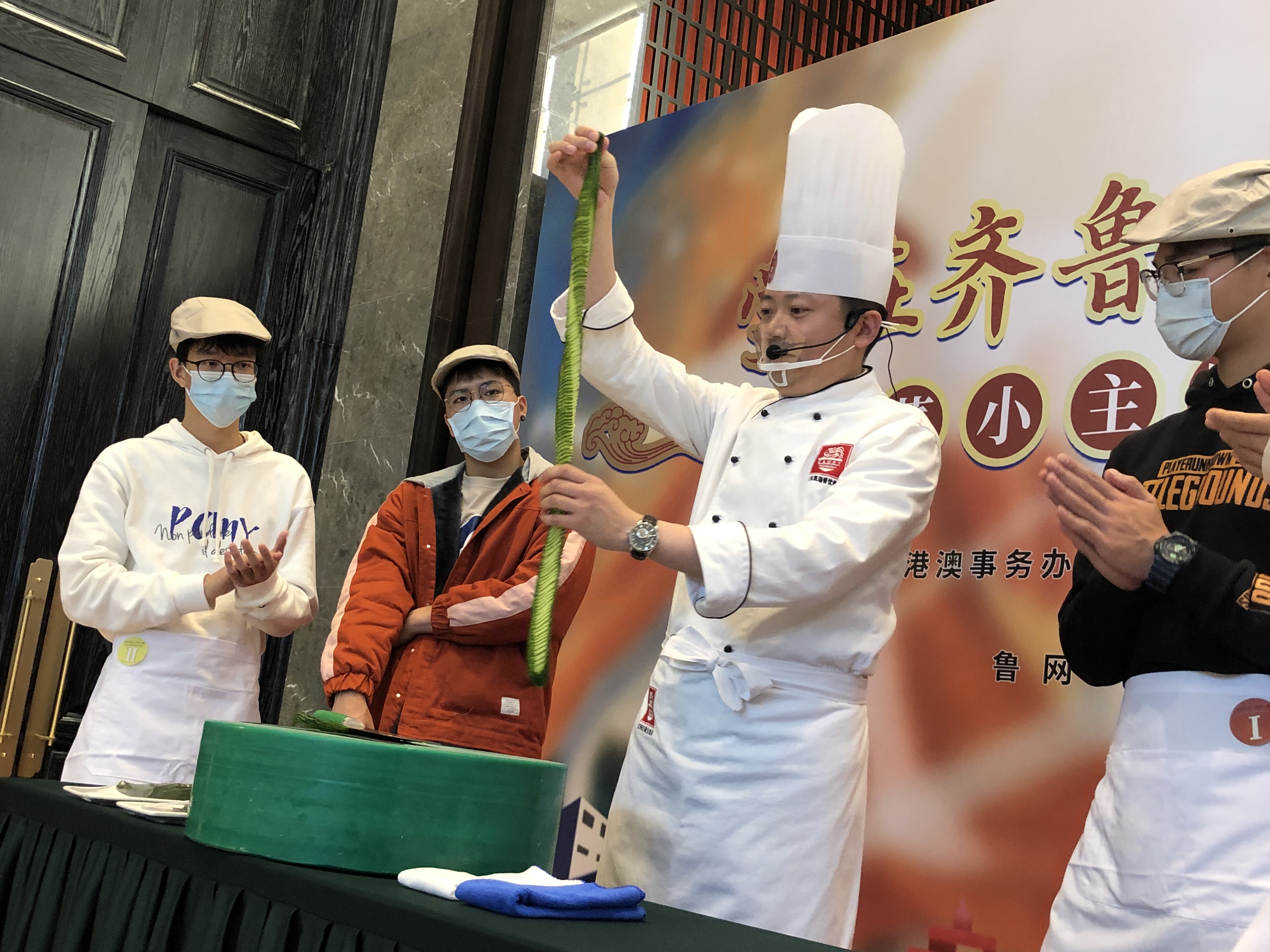 (大公文匯全媒體記者丁春麗、胡卧龍濟南報道)24日下午,「學在齊魯,品味山東」魯菜小主廚體驗活動在濟南舉行,28名港澳台學生參觀魯菜經典名菜製作過程,學習製作山東美食。