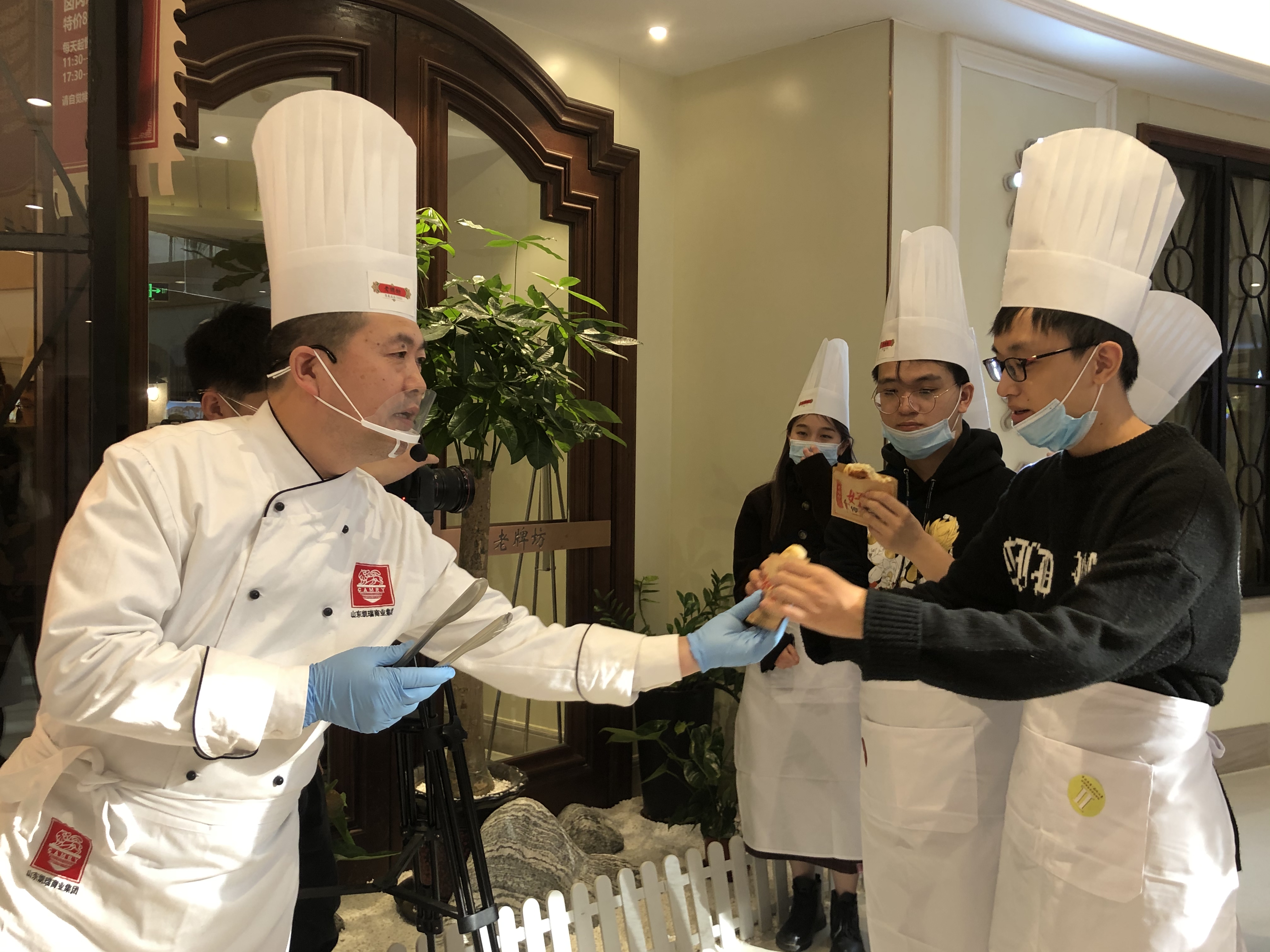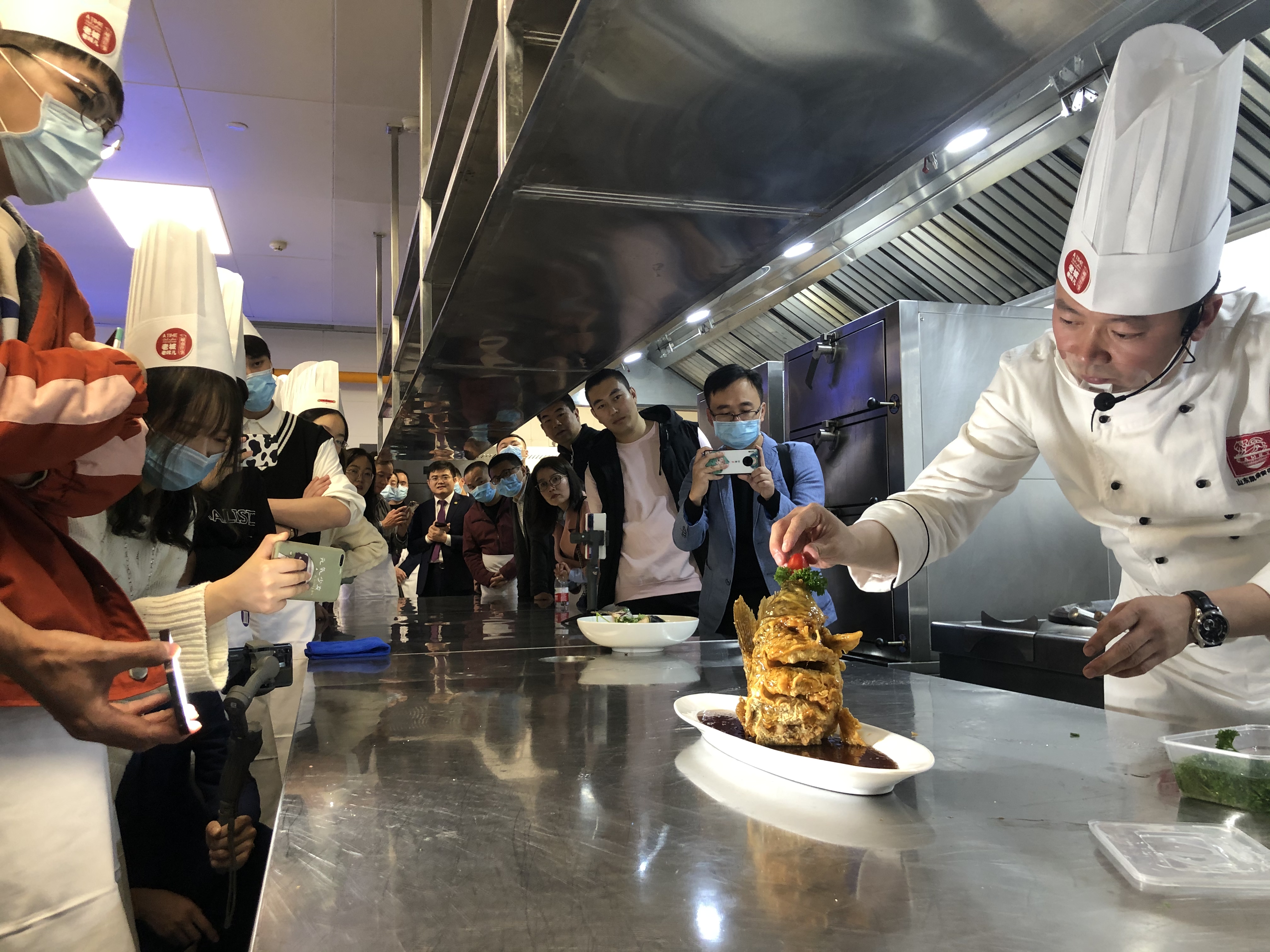 「製作糖醋鯉魚的大廚刀工太棒了!」正在山東大學讀大三的港生歐永楷第一次走進中央廚房參觀魯菜製作過程,他為凱瑞集團旗下城南往事廚務總監尹明玉的刀工點贊不已。「鯉魚要補水、按摩、裹粉,再入油鍋定型。」尹明玉一邊製作過程,一邊用幽默的語言來為同學們做細緻的介紹。當一盤造型別緻的糖醋鯉魚擺在同學們面前時,同學們紛紛拿出手機拍照。